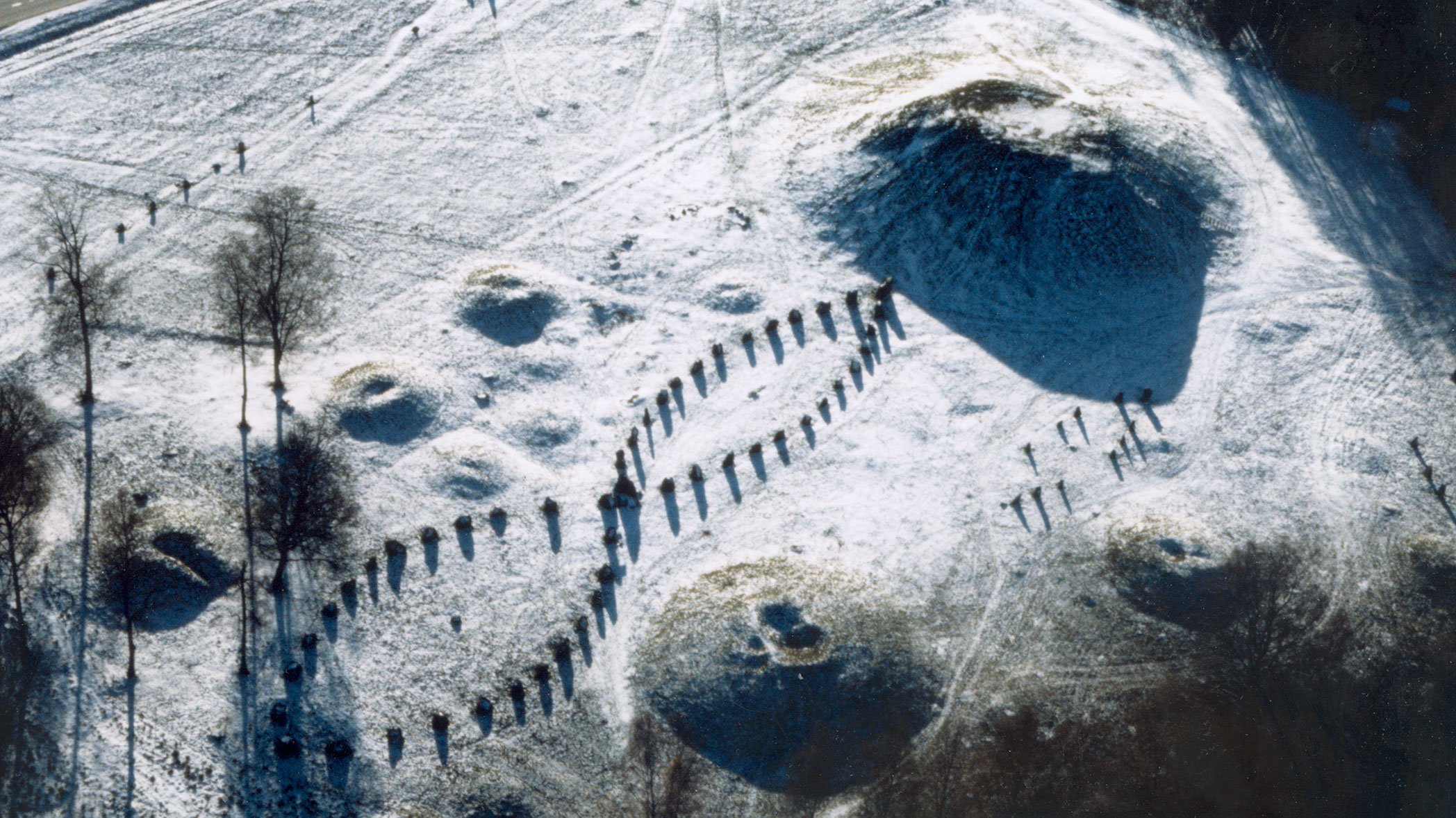 STARTBILD: Anundshögsområdet från luften. Till höger syns den mäktiga Anundshög och till vänster två av de största skeppsättningarna. Foto Västerås kommun.
