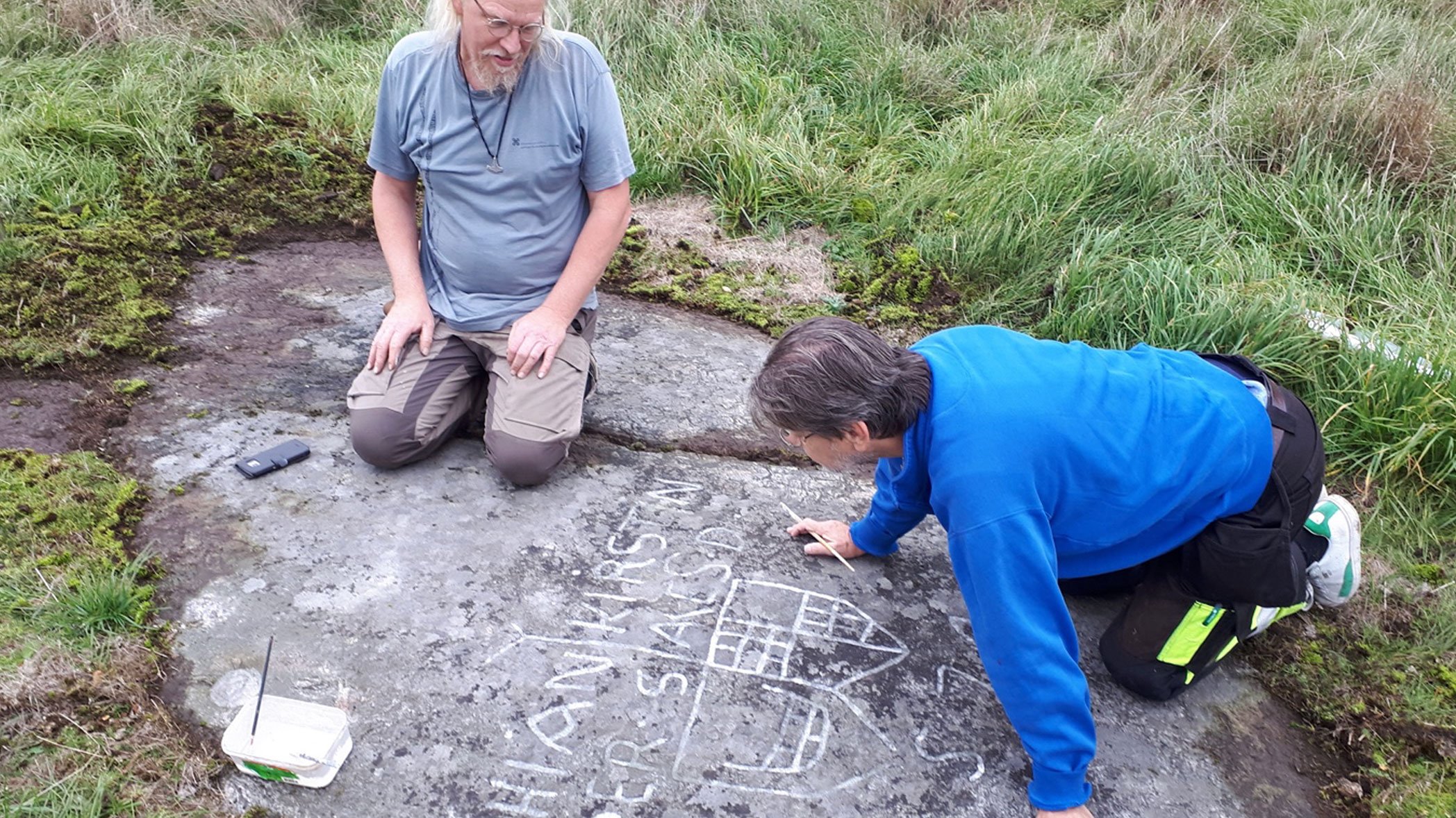 Här hittar de en hällristning från Medeltiden